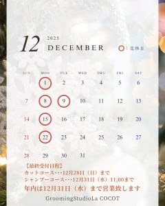 ※12月の定休日は1日(月)・8日(月)・15日(月)・22日(月)です
